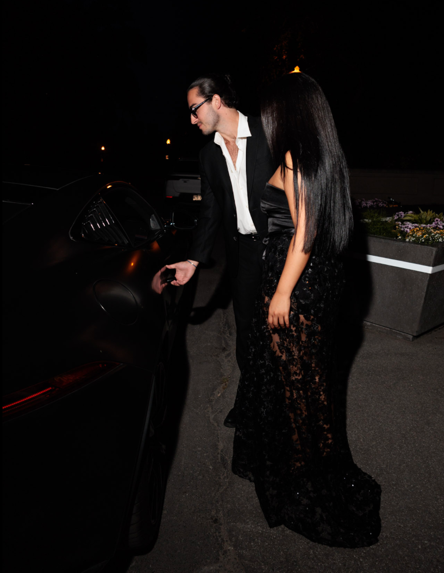The Midnight Set is designed for unforgettable moments. Featuring the signature Bella Crop Top, a corset-style satin piece that sculpts and defines, paired with a high-waisted sheer skirt embroidered with jet-black florals. The layered lining adds softness while the bold slit gives movement and edge.
